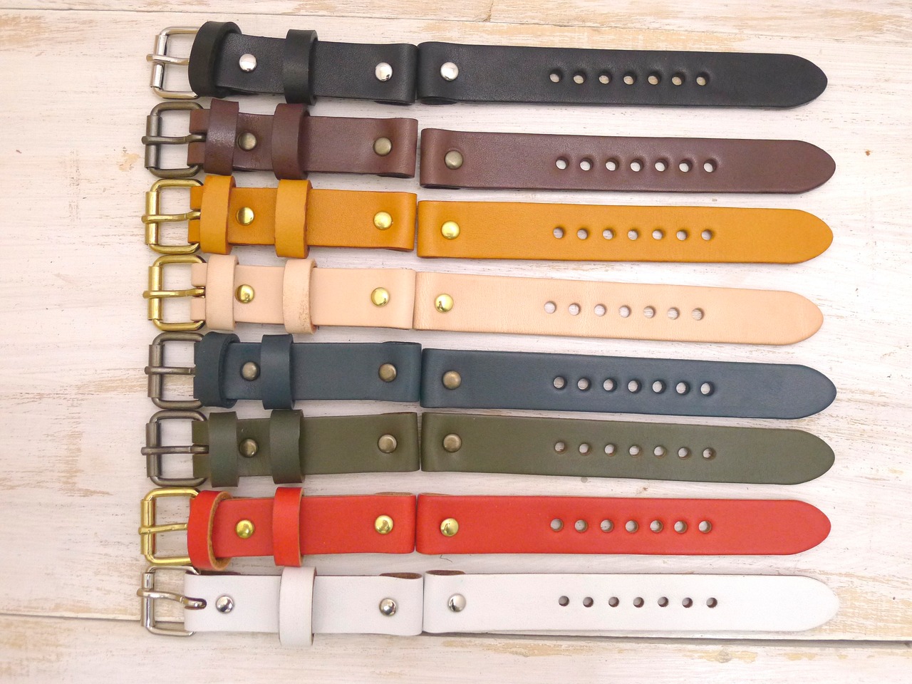 画像9枚目上から黒・焦げ茶・キャメル・ヌメ・紺(少し緑がかった紺色)・カーキ・赤・白。