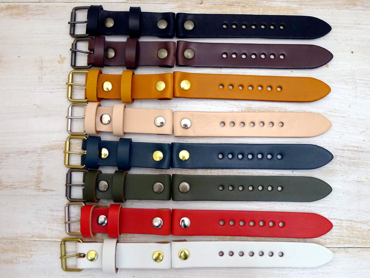 画像9枚目上から黒、焦げ茶、キャメル、ヌメ、紺(少し緑がかった紺色)、カーキ、赤、白。