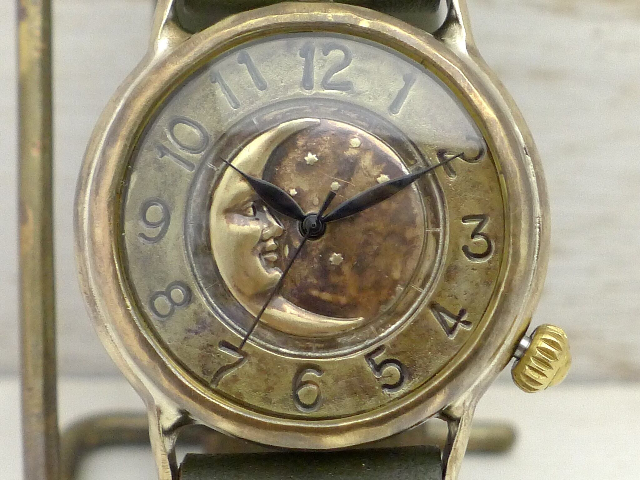 立体的な三日月とアラビア数字インデックス、古美仕上げのケースでアンティーク感あるモデルです。