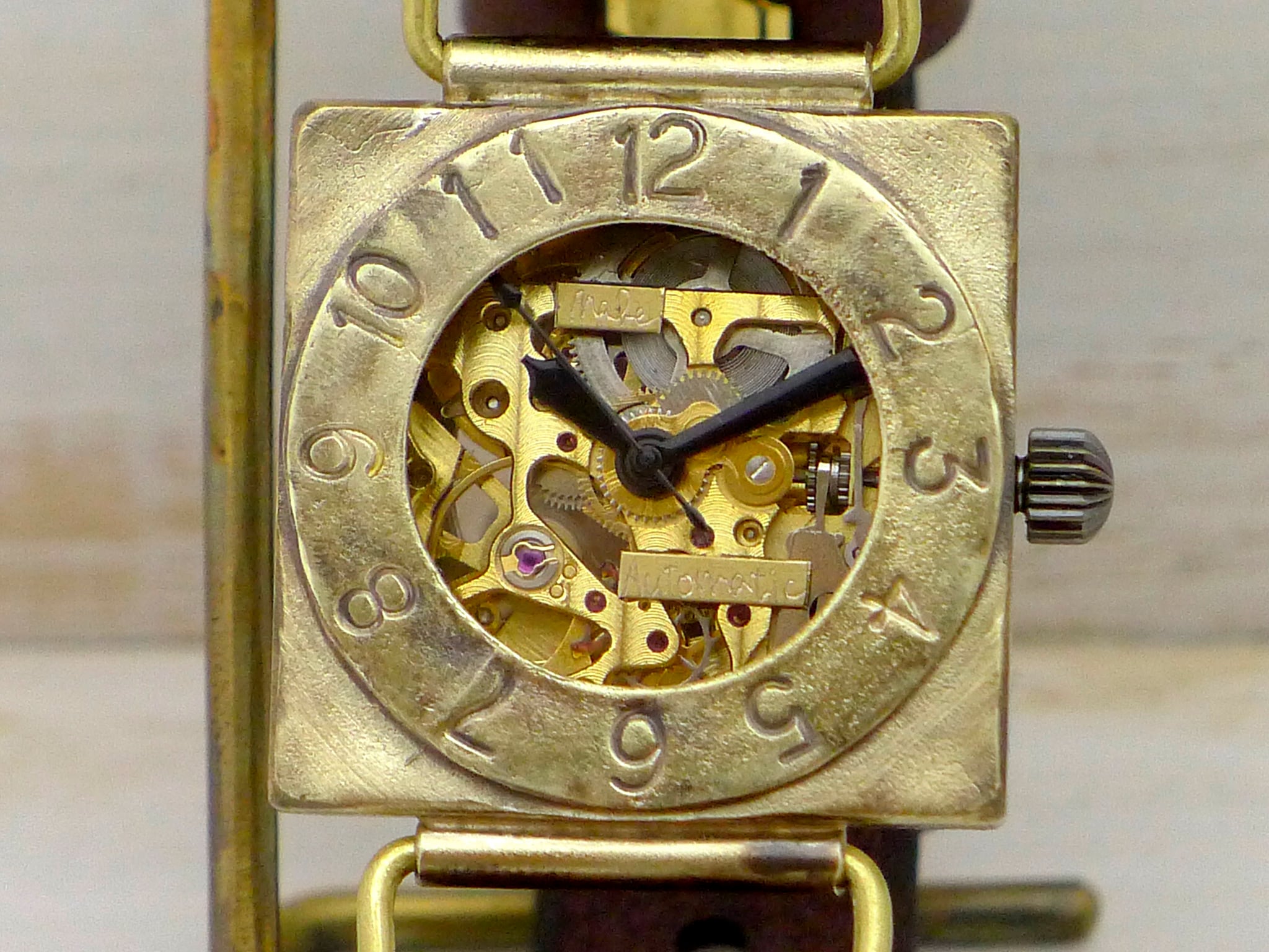 機械式ムーブメント、個性的なスクエアケース、アンティーク感ある真鍮の素材感がマッチしたモデルです。