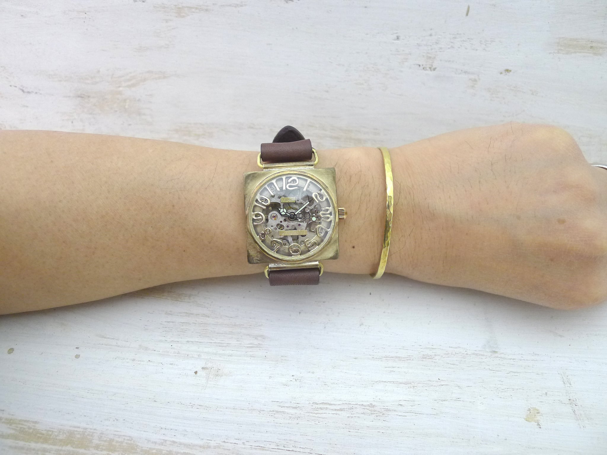 機械式ムーブメント、個性的なスクエアケース、アンティーク感ある真鍮の素材感がマッチしたモデルです。