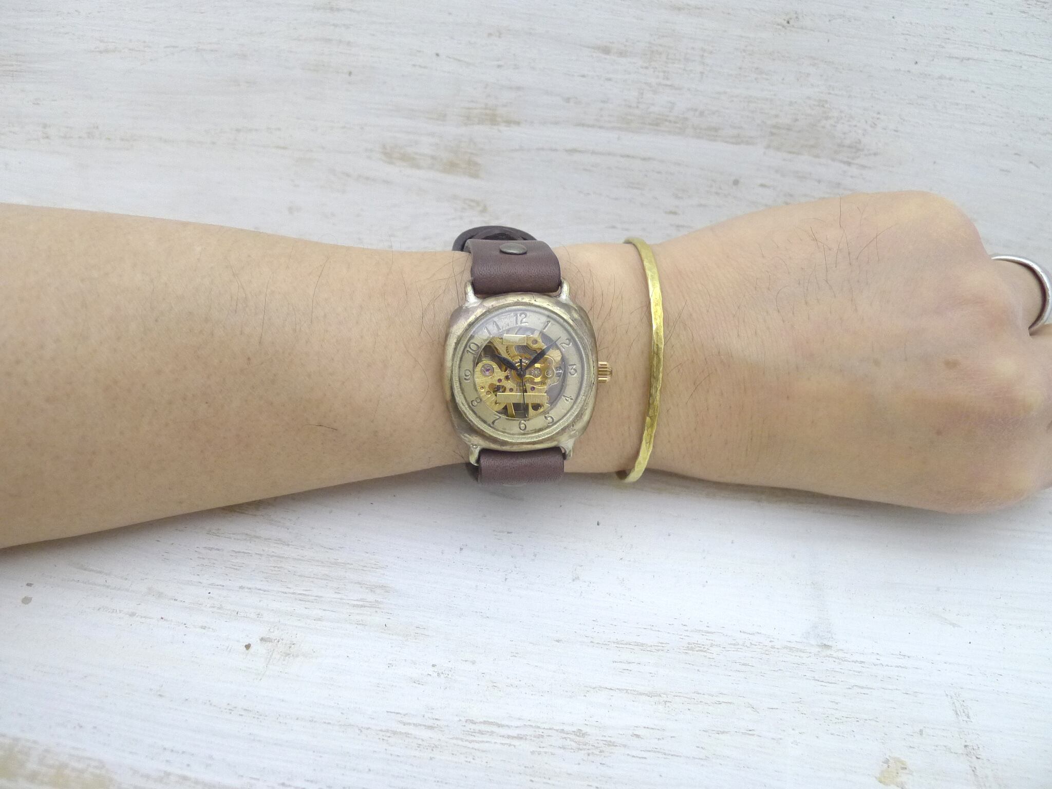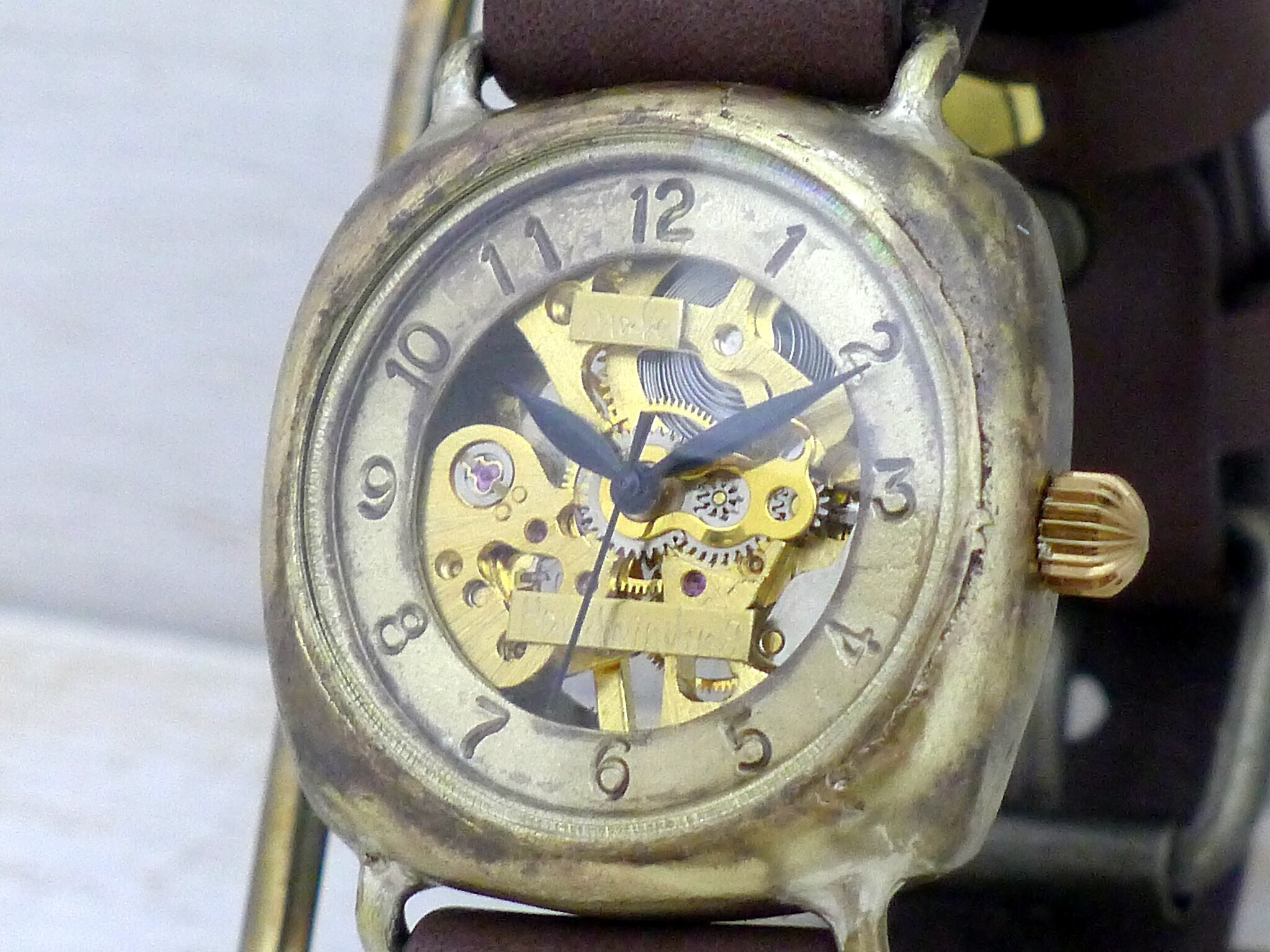 機械式ムーブメント、コロンとしたクッションケース、アンティーク感ある真鍮の素材感がマッチしたモデルです。