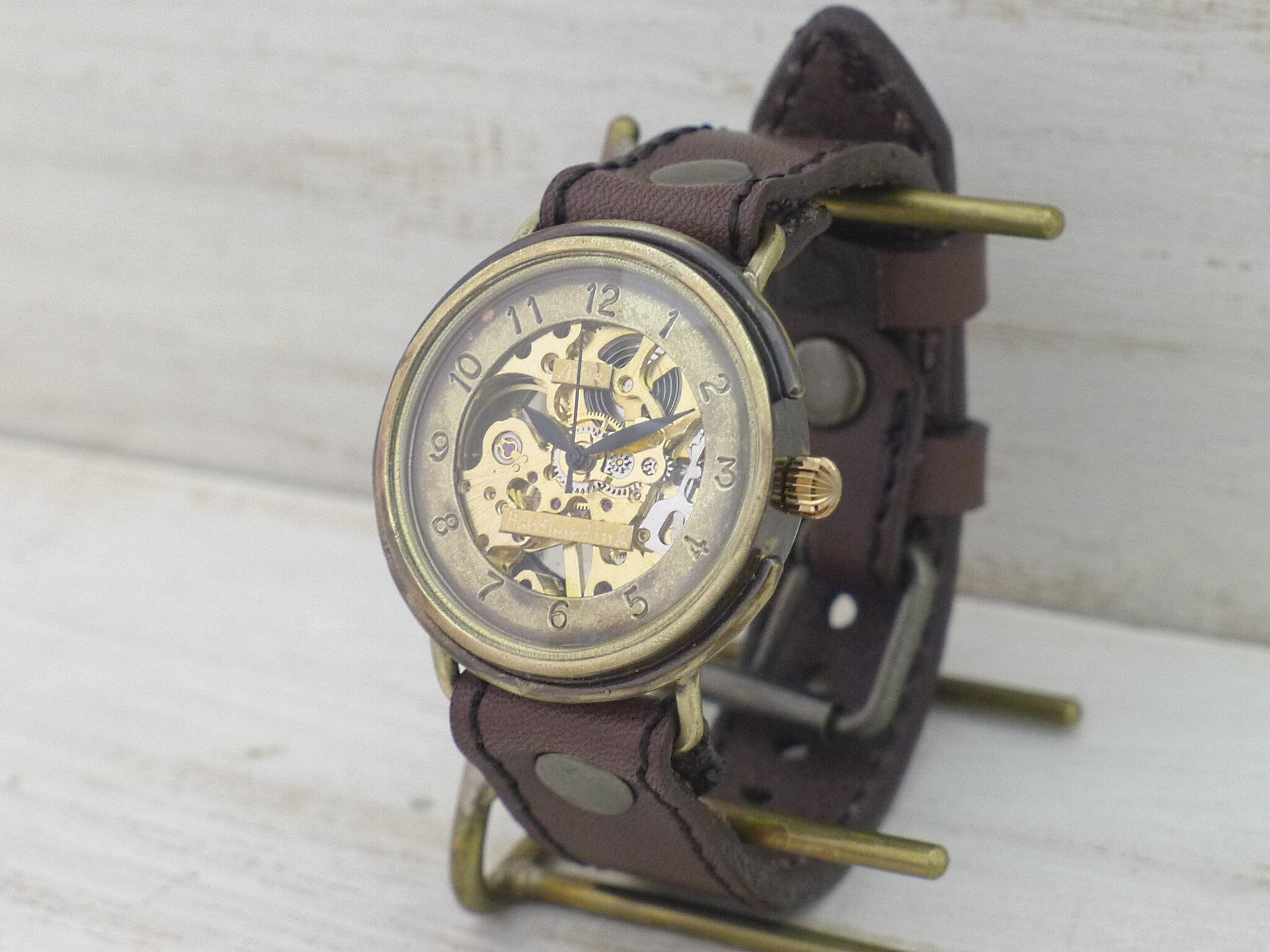 BHW059 手巻きBrass36mm アラビア数字 ミシンステッチベルト 手作り腕時計 [BHW059ミシン]